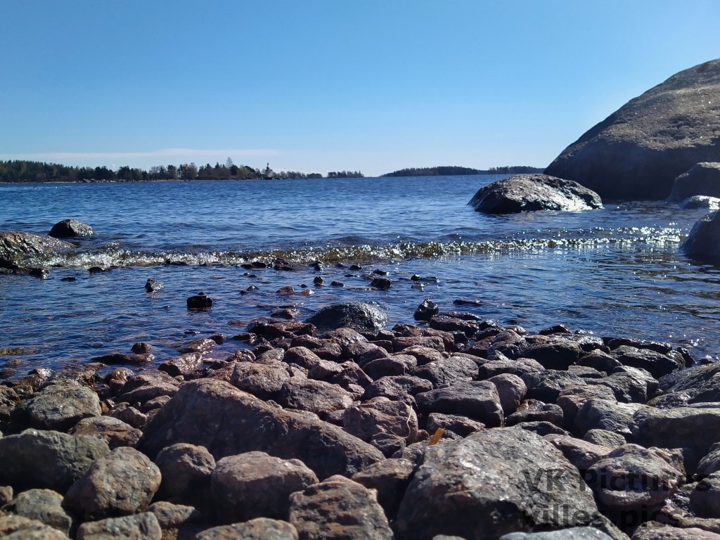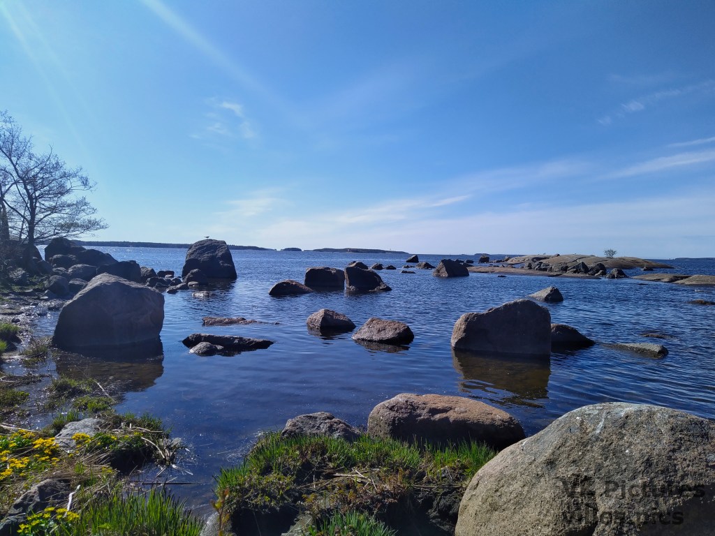 The coast of Luotsi-Kuusinen is rocky with alot of pebbles and larger rocks.