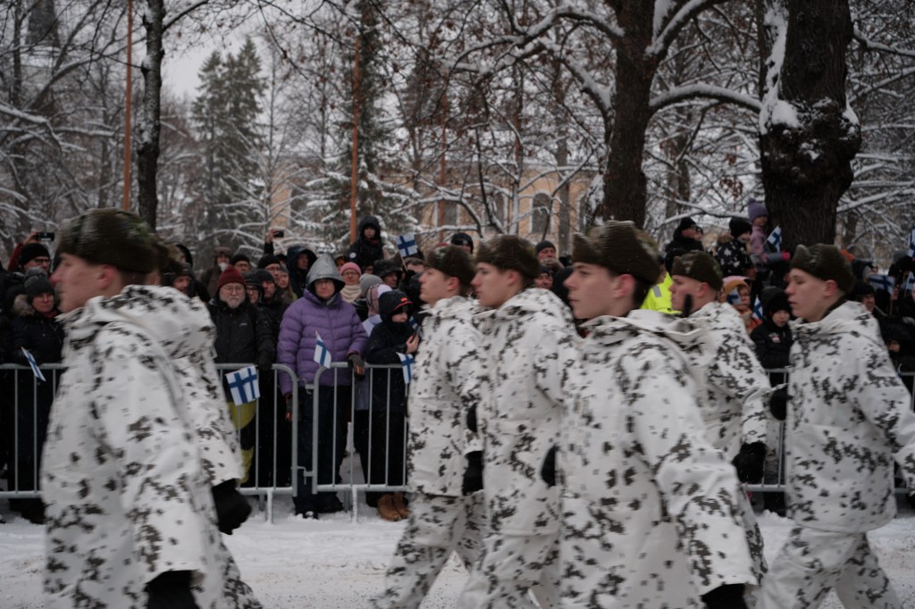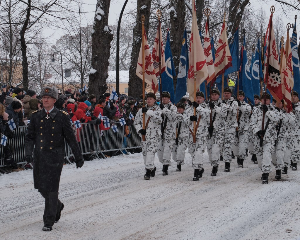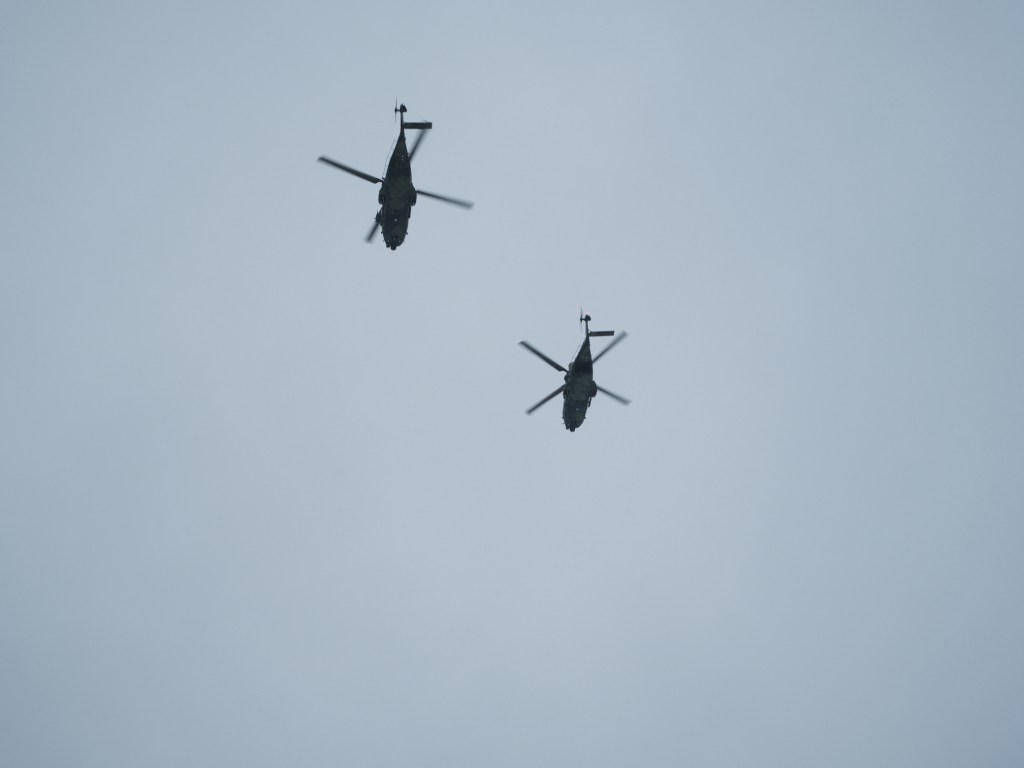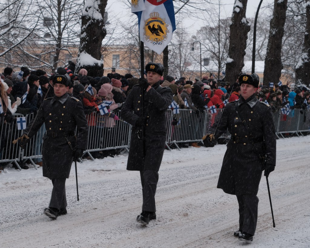 The Finnish Army and Airforce flew helicopters and aircraft overhead during the parade. The visibility was too poor to get a good picture of the planes, but the helicopters flew low enough to be visible.
