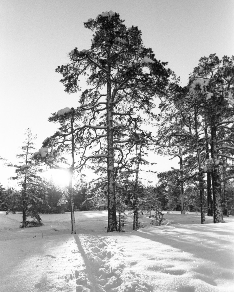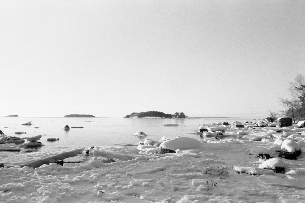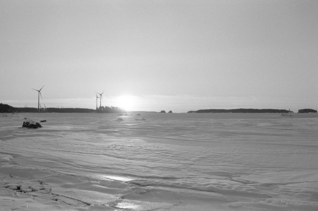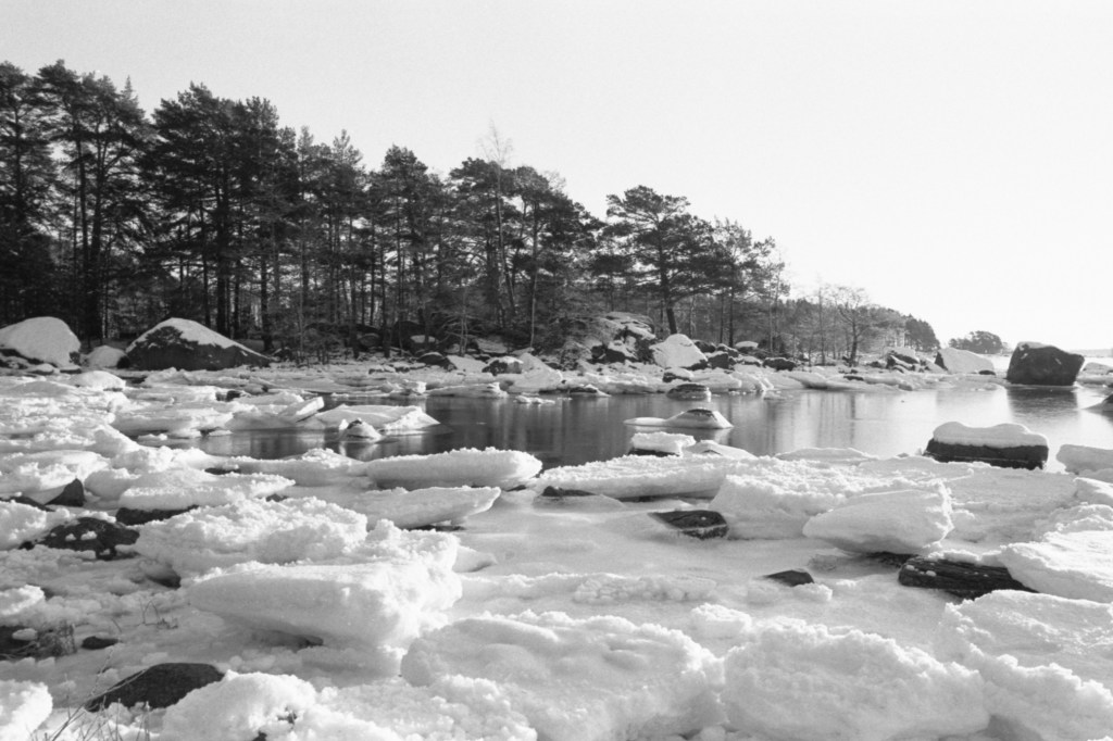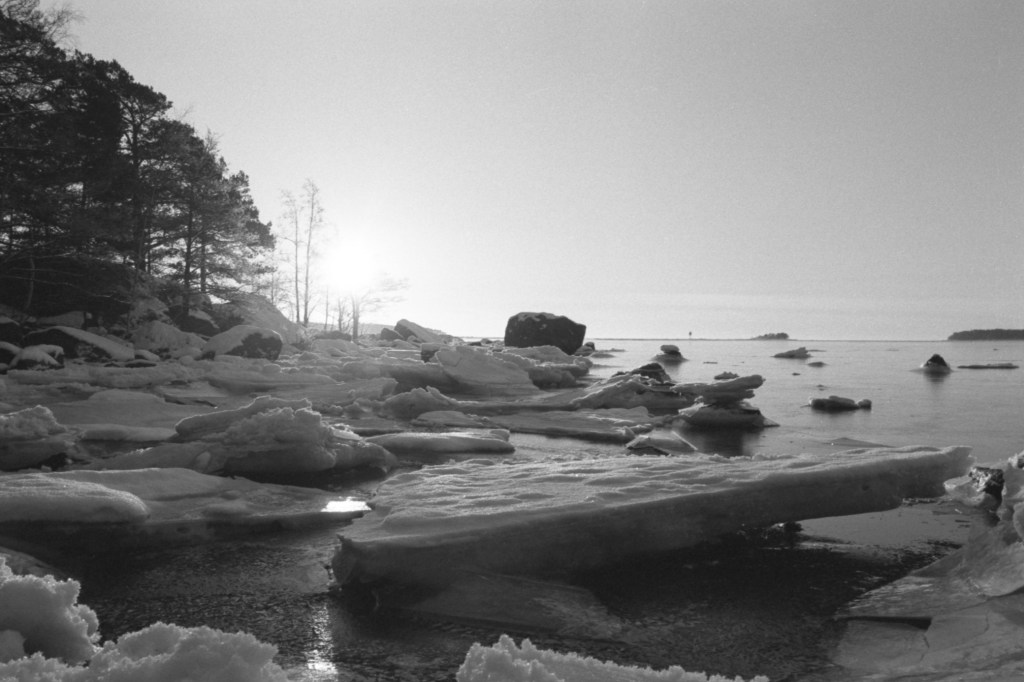 I took some pictures while walking through both the paths and from the frozen beach at the Santalahti resort. I got a new 28 mm lens in addition to my 50 mm lens that I had been using for my Pentax K1000. Some of these pictures are taken with the wider 28 mm lens and some with the 50 mm. The film I used was Kodak Tri-X 400, which I think might not be the best film for these landscape shots, but I bought alot of it a while ago so I will use it up.