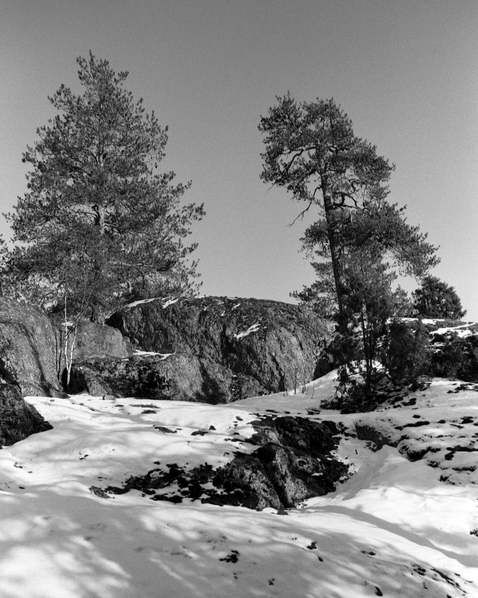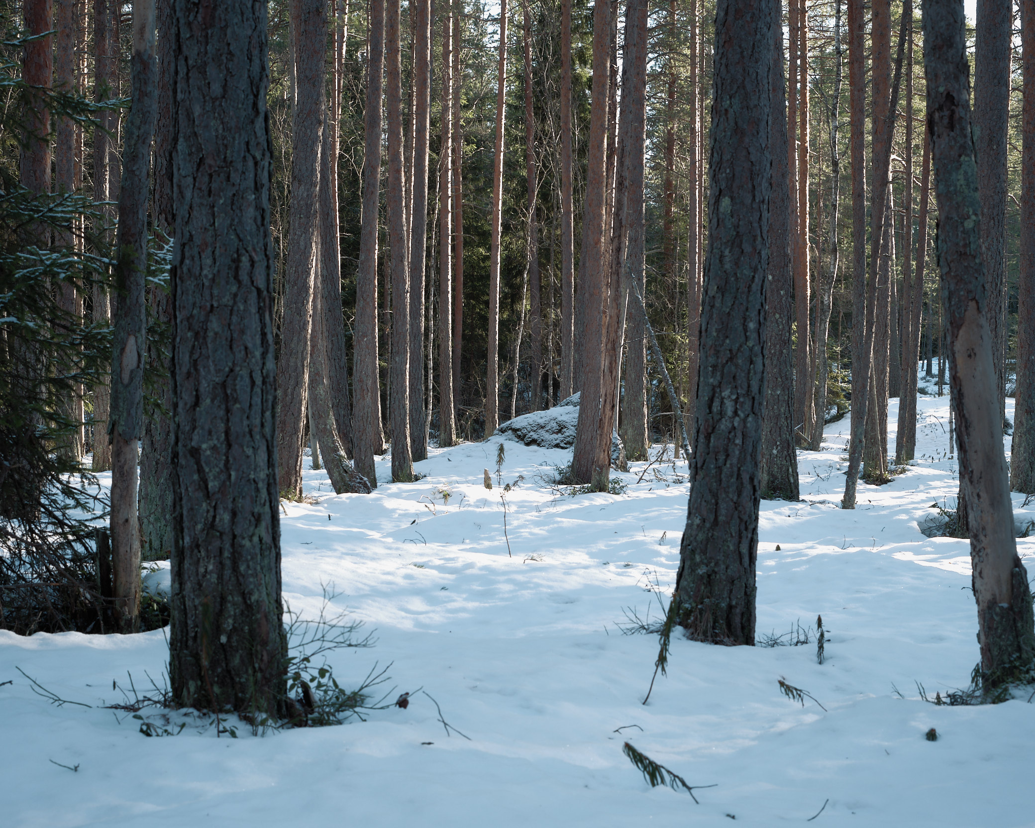 I took a bunch of pictures from the forest but also from the Storträsk lake and the Högberget hill. Since I now have a larger backpack, I took both a digital camera and a film camera with me along with a tripod and other equipment. Because I now had a tripod, I decided to try some very low-sensitivity film. All the colour pictures here are taken with a digital camera and all black-and-white pictures are taken with Ilford Pan F Plus film with an ISO of 50.