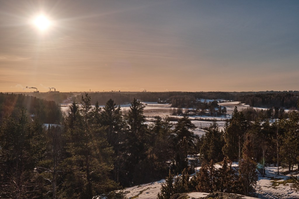 Högberget is a small hill in southern Sipoonkorpi. The top has some small cliffs and boulder but is mostly very flat and covered with trees. The visibility from the hill is blocked by trees expect to the east towards the city of Vantaa. When I arrived there, the sun was just shining directly from east. In a normal picture from there, the ground would be just black if the sky was visible at all. I attempted to take a picture looking towards Vantaa from the hill and using the HDR setting on my camera, I did manage to take a picture where you can see the factories in Vantaa and (and/or maybe Helsinki) on the horizon with the sun shining directly towards the camera. I think it looks pretty disgusting but it’s also kind of cool that you can do that.