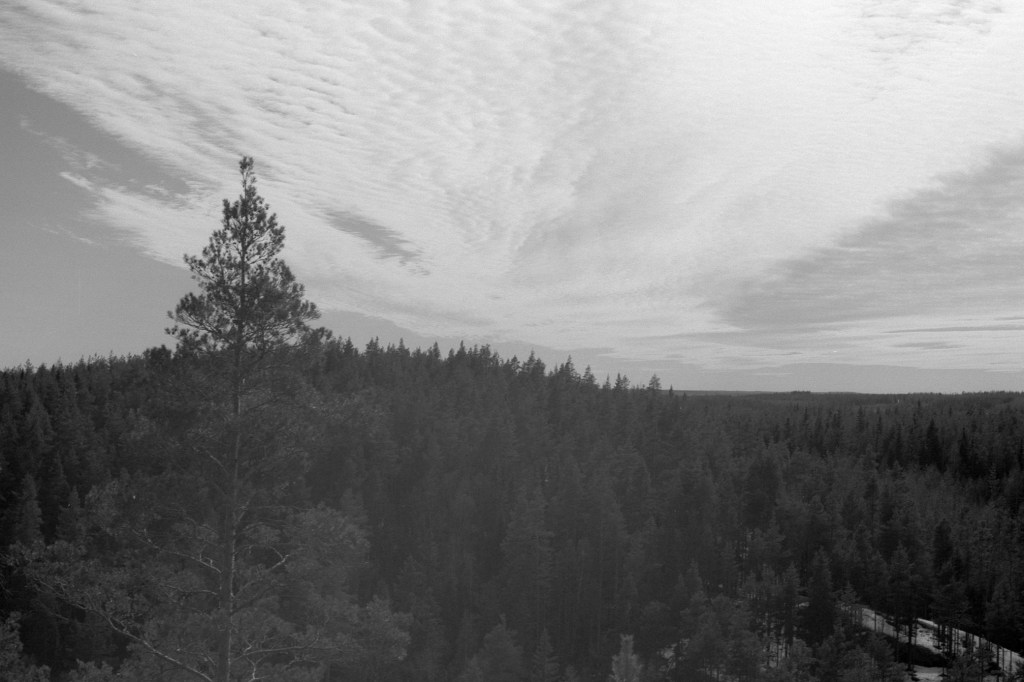 The Repovesi national park is an area of small lakes and hills near the Repovesi Lake. I had to move from my apartment for a few weeks to the city of Kouvola, which is near Repovesi. While in Kouvola, I decided to go see how Repovesi looked in spring and to take some pictures there. Many of the lakes were still partially frozen and snow covered the ground in places that were in shadow. The color pictures are taken with a digital camera, while the black-and-white pictures area taken with a film camera.