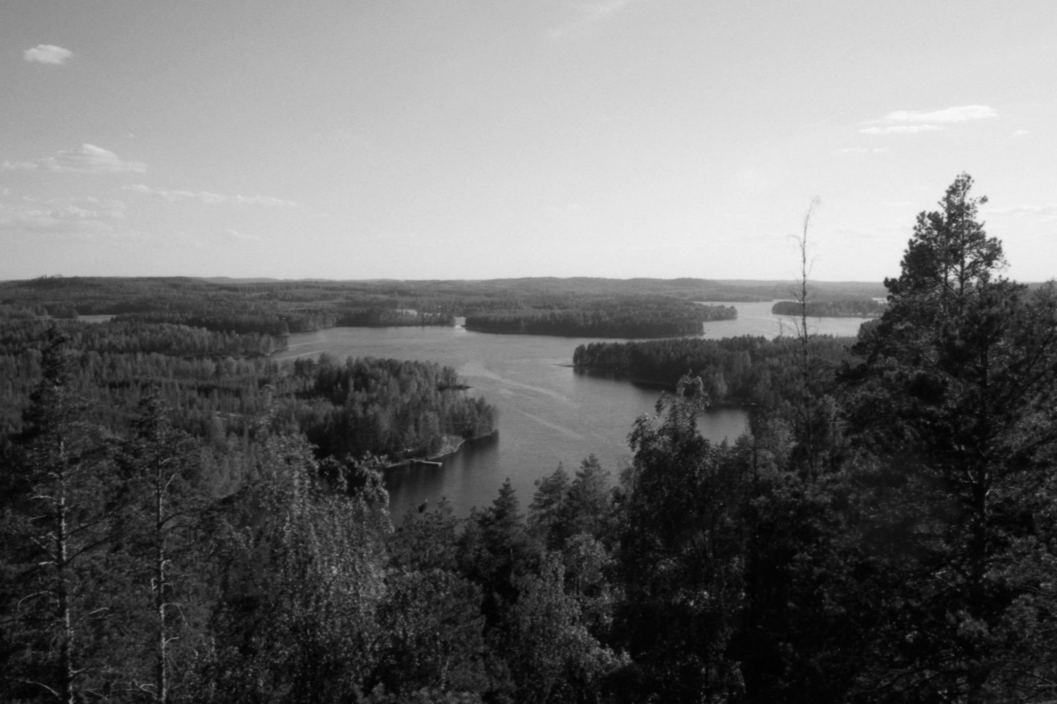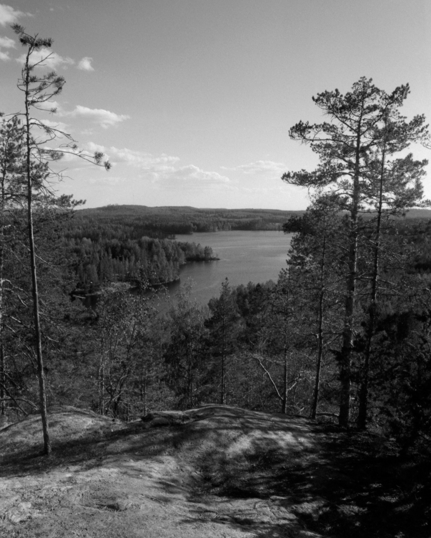 The large hill of Neitvuori is the highest hill in South Savo. Its top is 184 m above sea level and 110 m higher than the lake Saimaa, which can be seen from the hill. I took the following pictures from the hill during a nice spring evening. It turns out that during evening, the sun is shining almost directly from the direction of the best views, which made it more difficult to take pictures of them. The color pictures are taken with a digital camera and black-and-white pictures are taken with film.