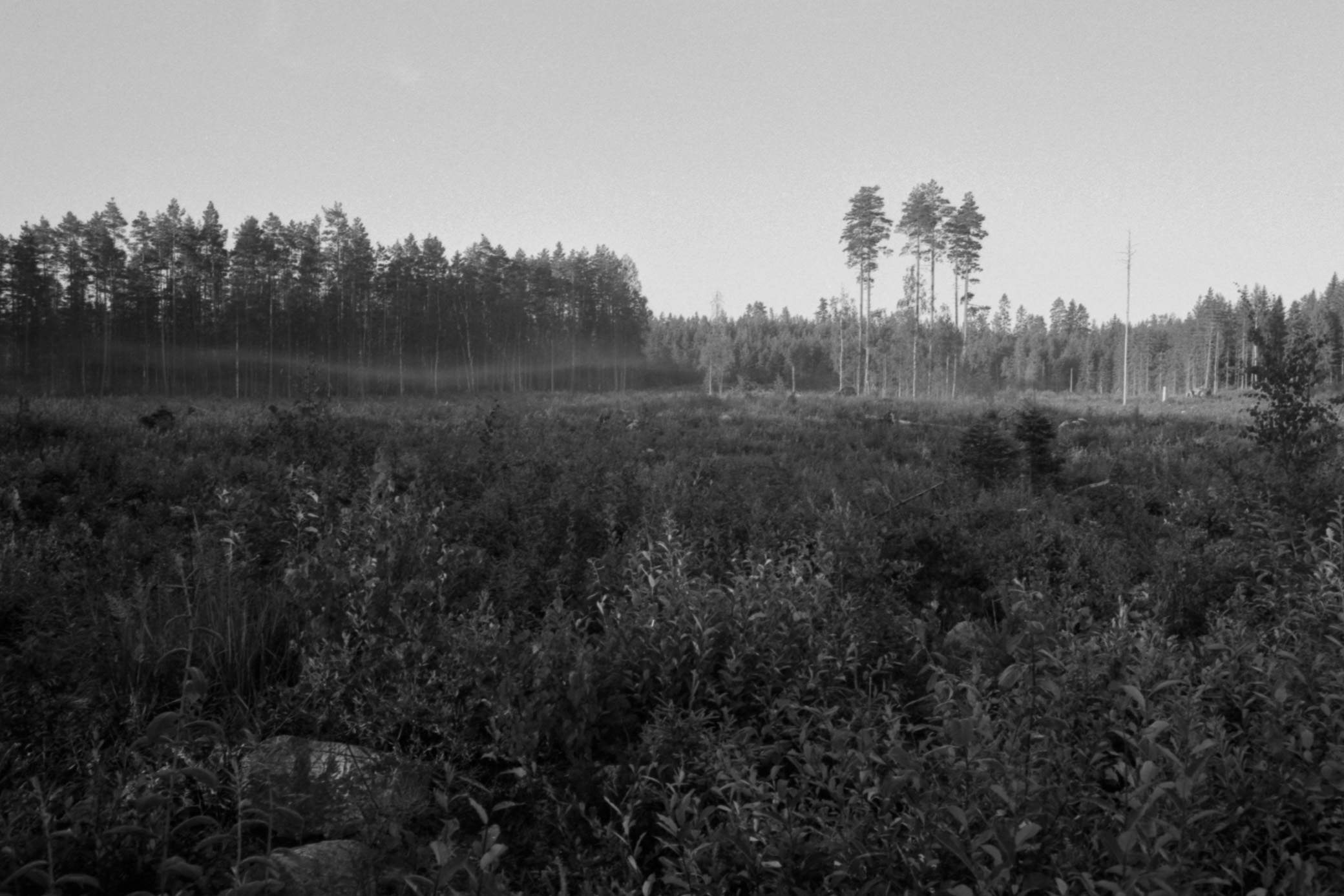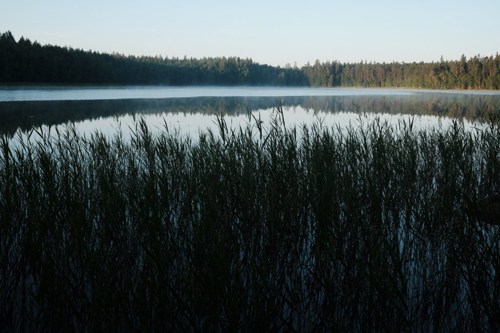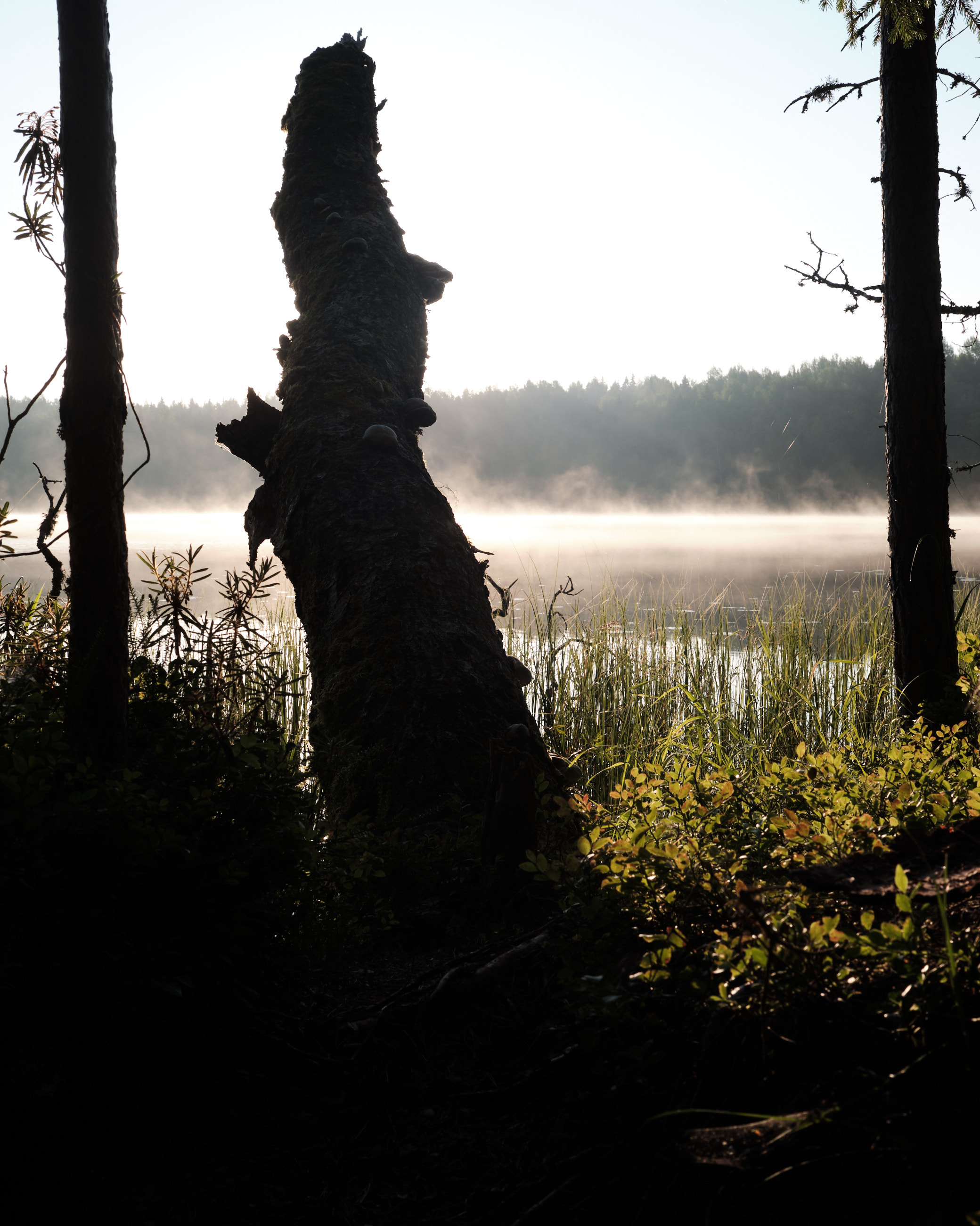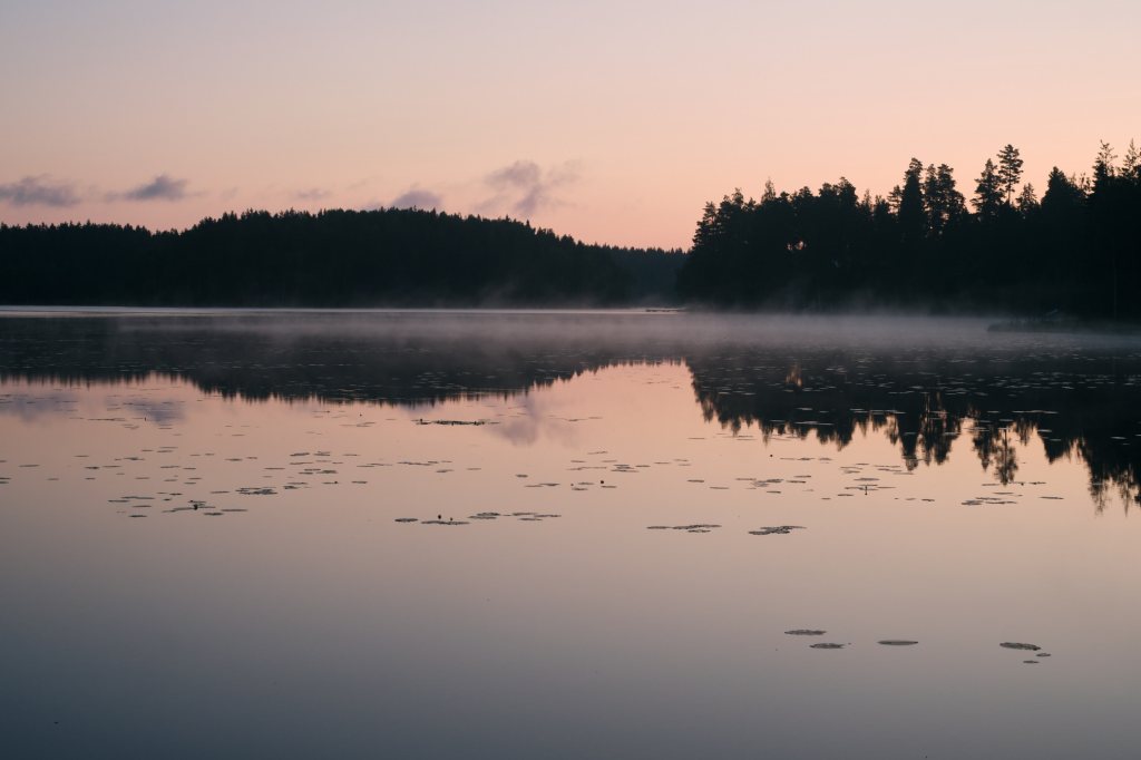 During morning, some fog was on the ground. This was visible in the smaller Ruonajärvi Lake, which was in the forest, and in an open area where logging had been done.