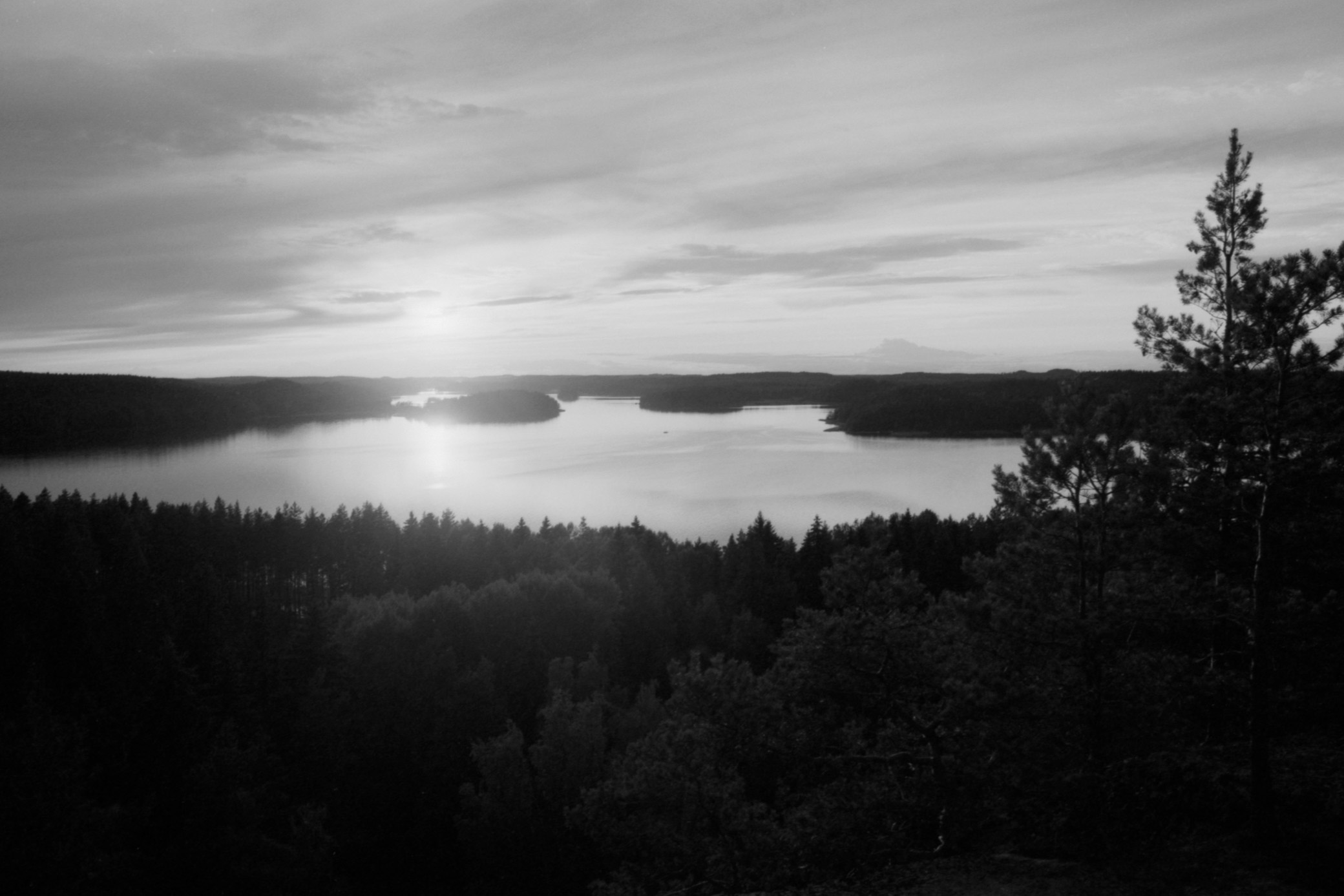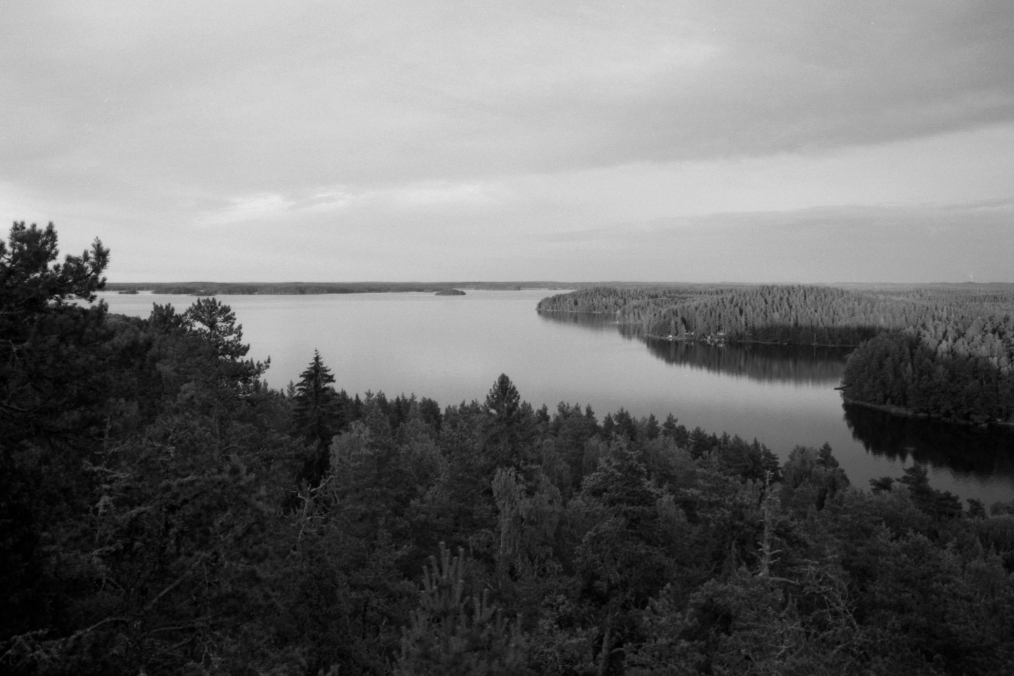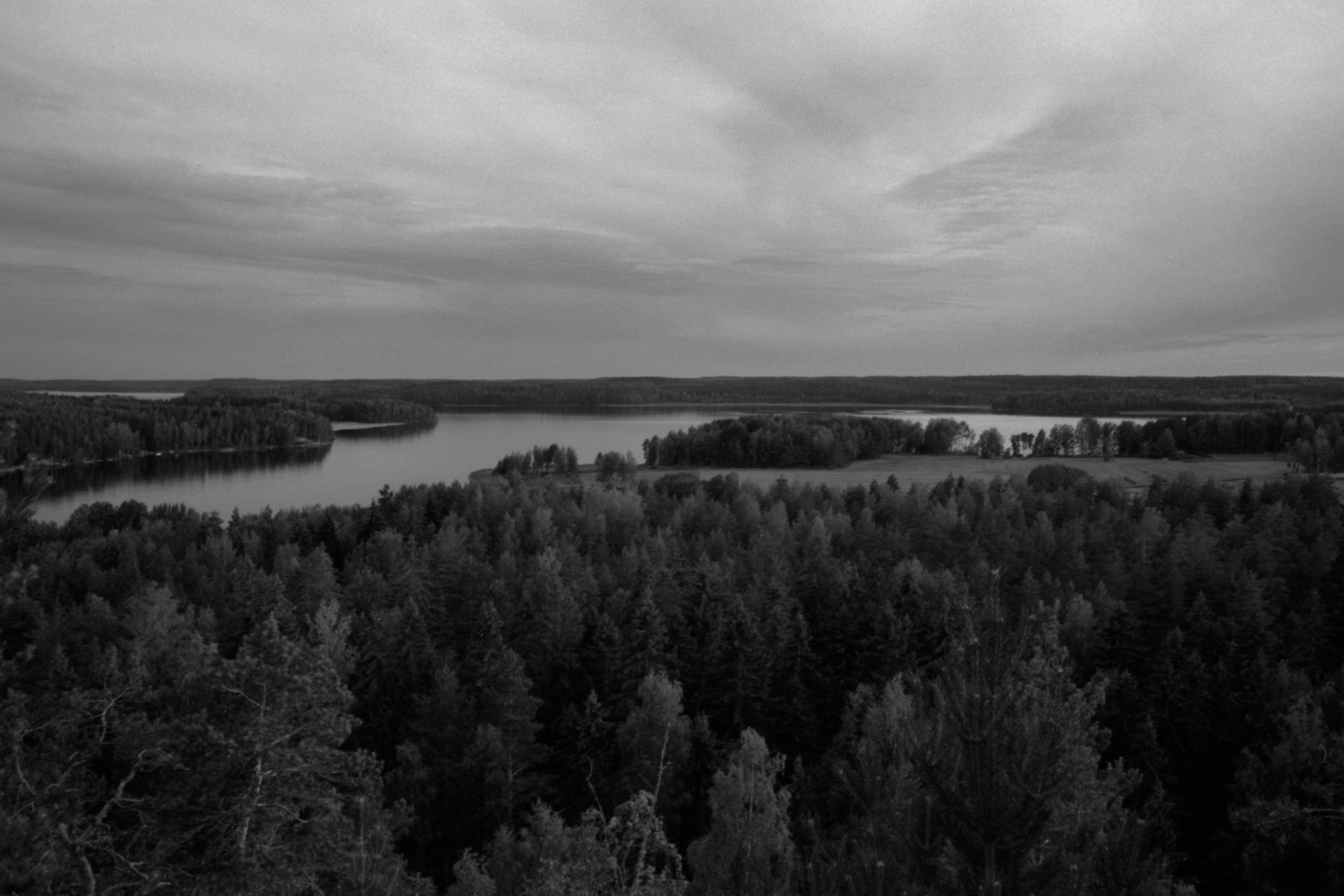 Hiidenvuori is a small hill on an island of the Pyhäjärvi Lake. It’s located about a half an hour drive to the north-west of the city of Kouvola. I went there during a week of really bad weather, and this evening was a small window of not constant rain. With me, I had a digital camera for taking color pictures and a film camera for the black-and-white pictures.