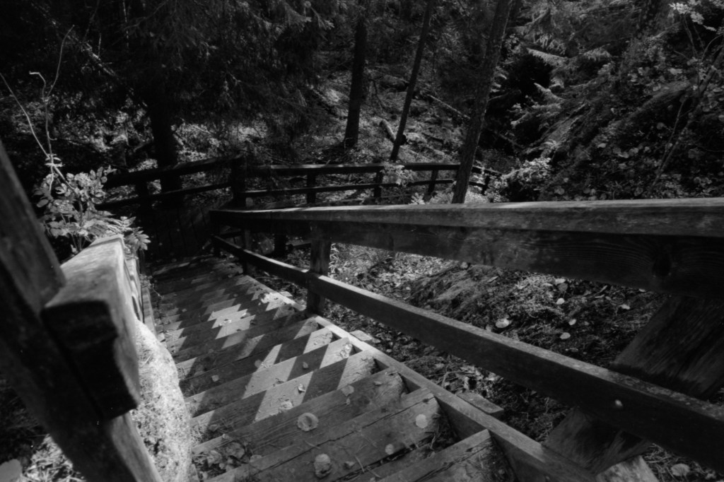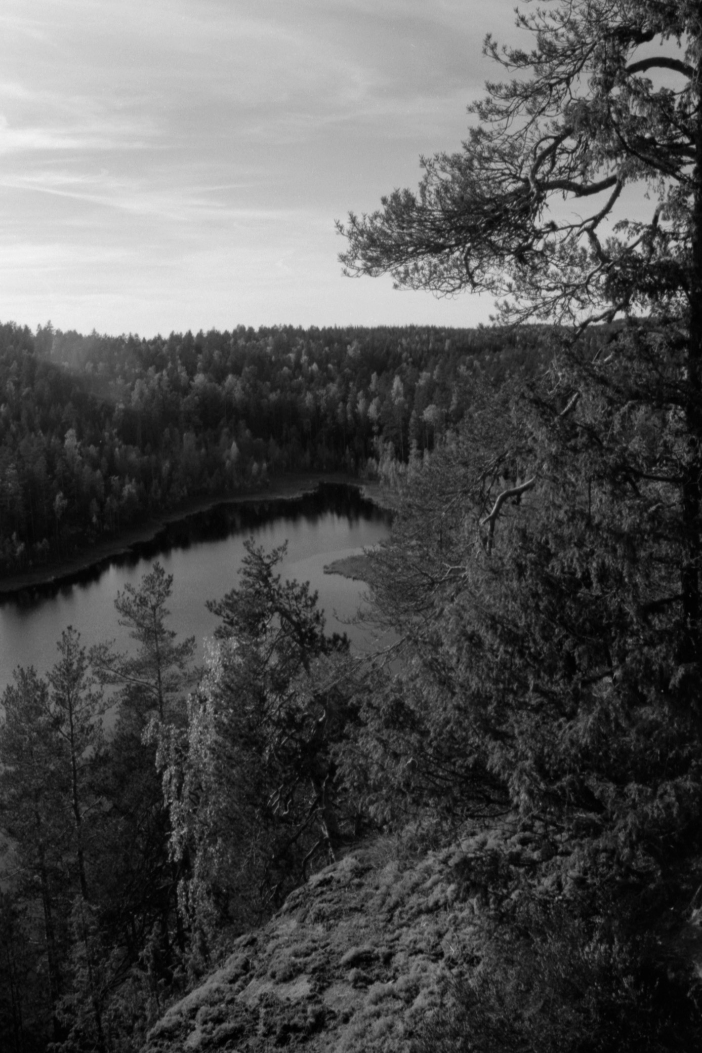 I went for a short trip to the Repovesi national park to take some pictures during early autumn. At Repovesi, there are some hills and lakes in the forest surrounding it. I arrived at the northern part during mid-day and only left after sunset. The color pictures are taken with a digital camera and black-and-white pictures are taken with film.