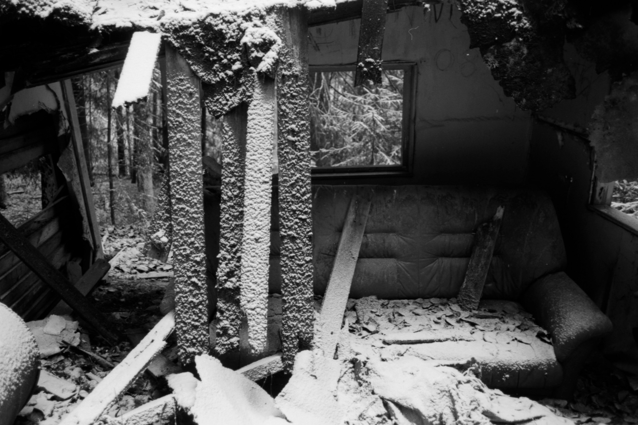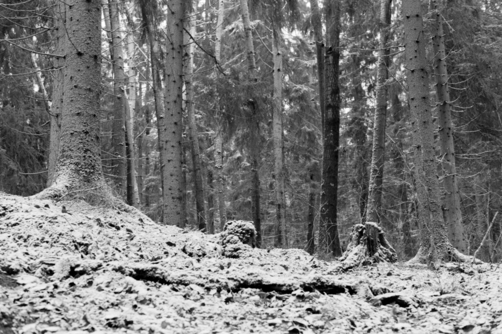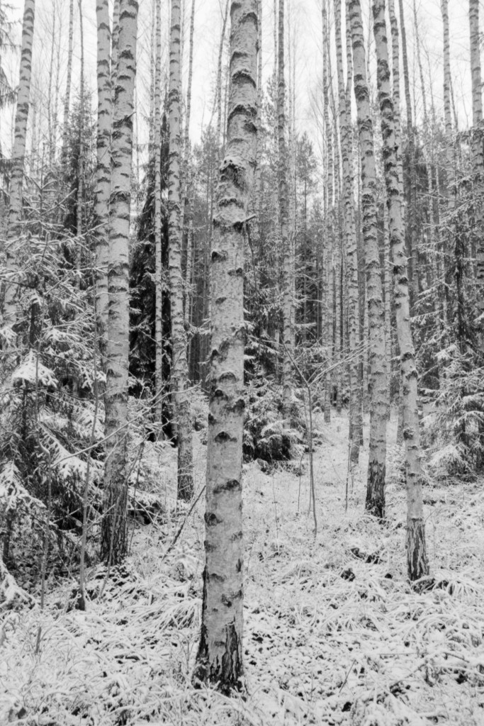 During early winter when there had only been a day of snowfall that did not immidiately melt, I visited a nature near the Käyrälampi lake in Kouvola. This lake is close to a popular amusement park called Tykkimäki and the path of the trail starts at a beach that is part of the park. Here are some pictures I took from the trail. The color images are taken with a digital camera and the black-and-white images are taken with film.