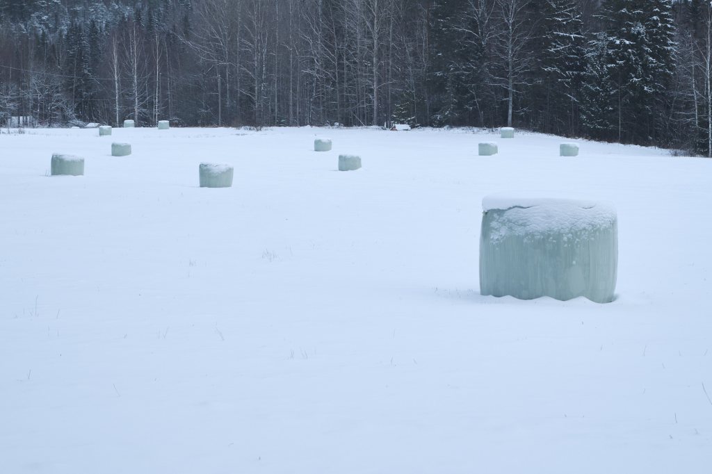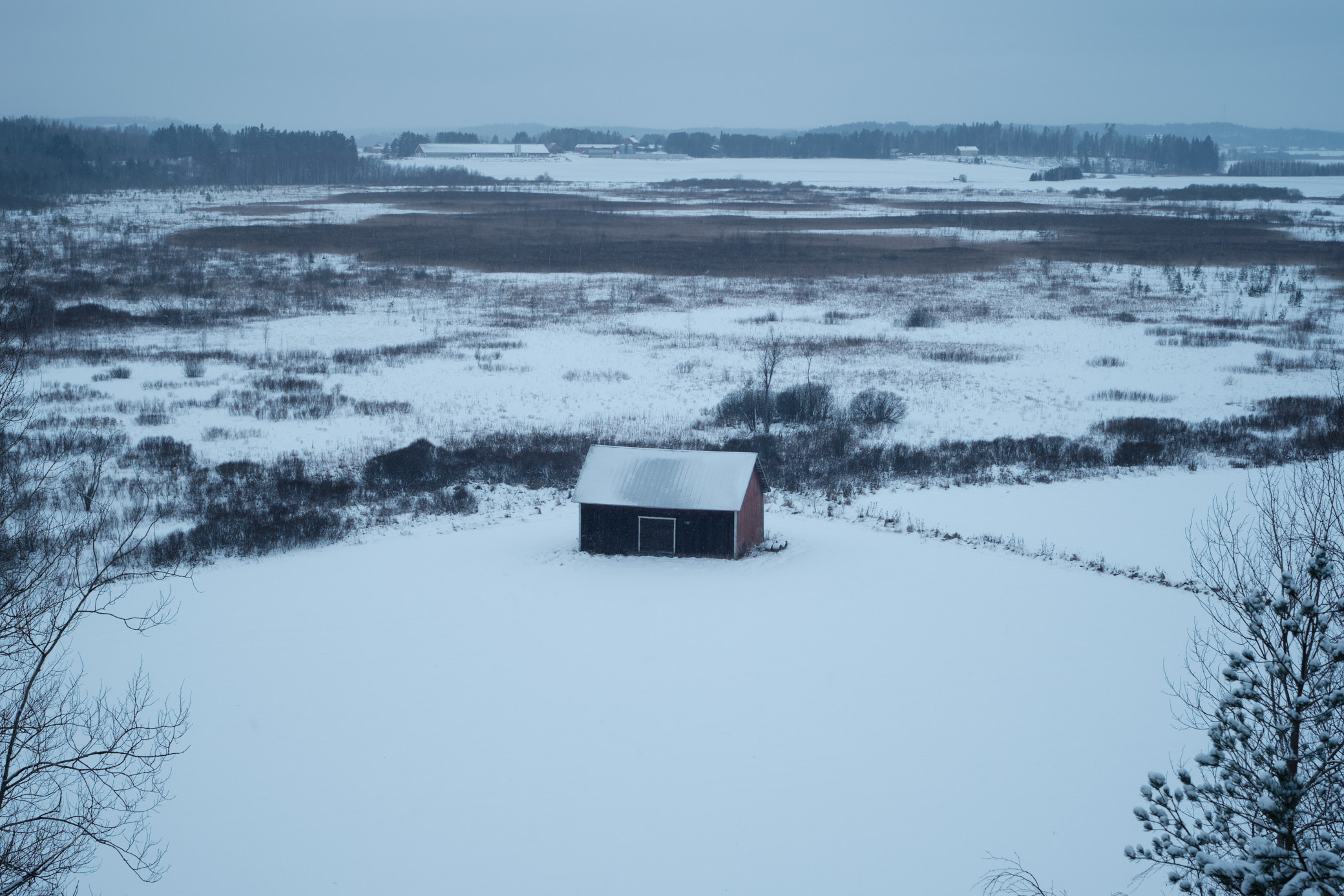 The nature trail actually had a visible trail in the snow, so I started following it. The trail went from a forest to some smaller hills. A few farms near Artjärvi town were visible from them.