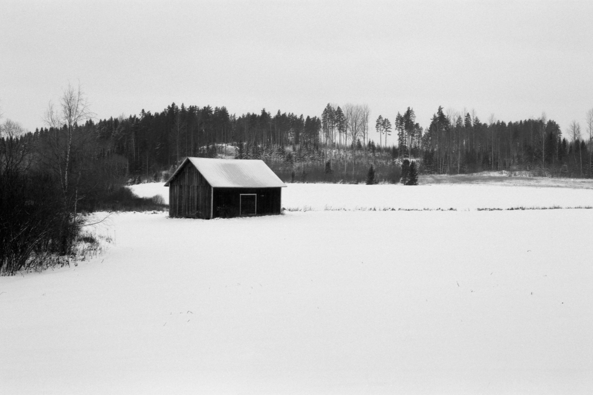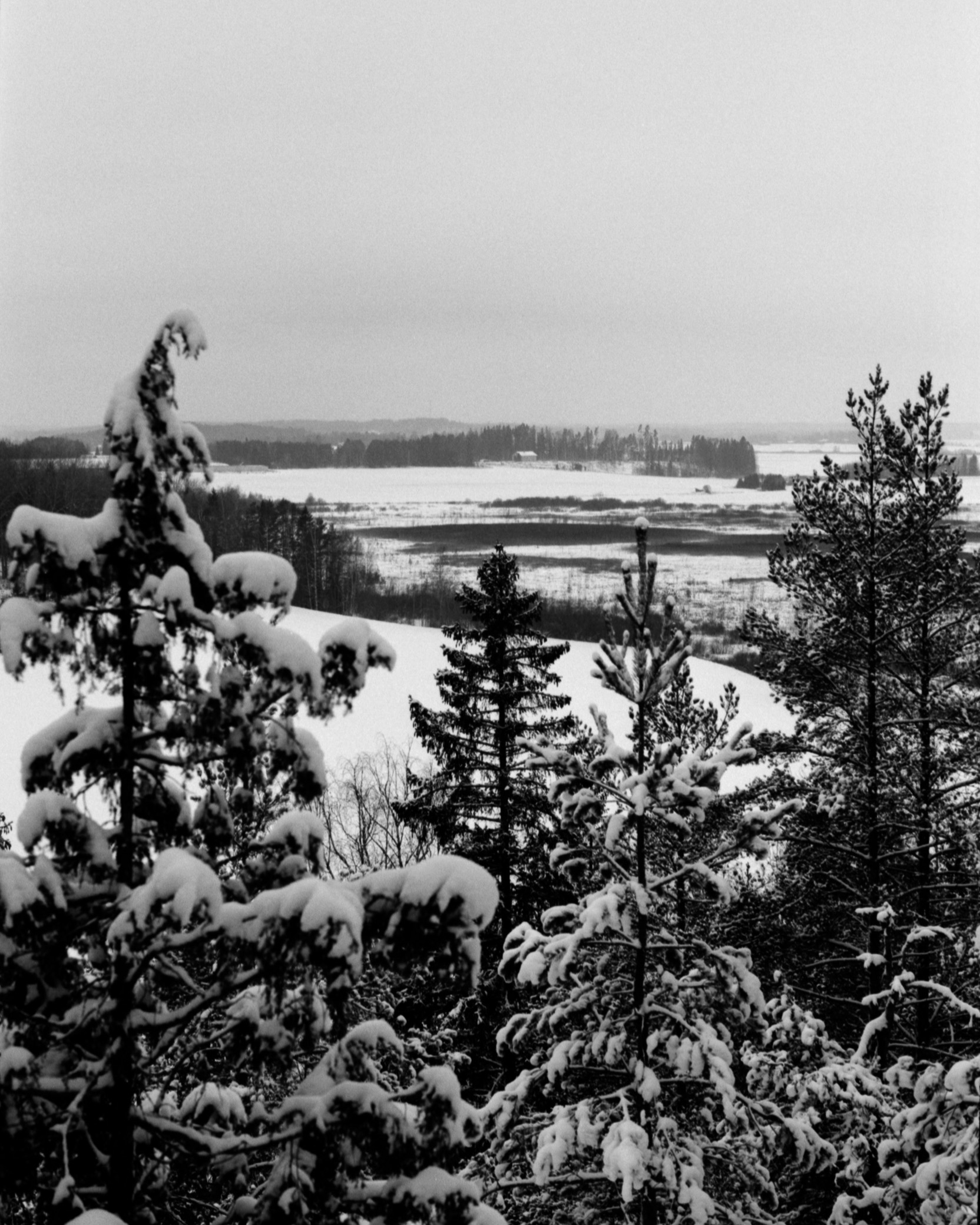 I took some pictures from a hill near the Pyhäjärvi lake and from the nearby Lamminpolku nature trail during a cloudy winter day. Pyhäjärvi lake is located on the border between two municipalities in southern Finland near the town of Artjärvi. Lamminpolku nature trail nearby goes to small hills to the east of Artjärvi. The color pictures here are taken with a digital camera and the black-and-white pictures are taken with film.