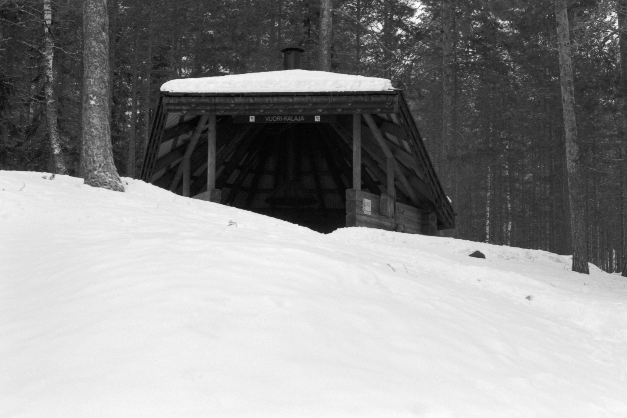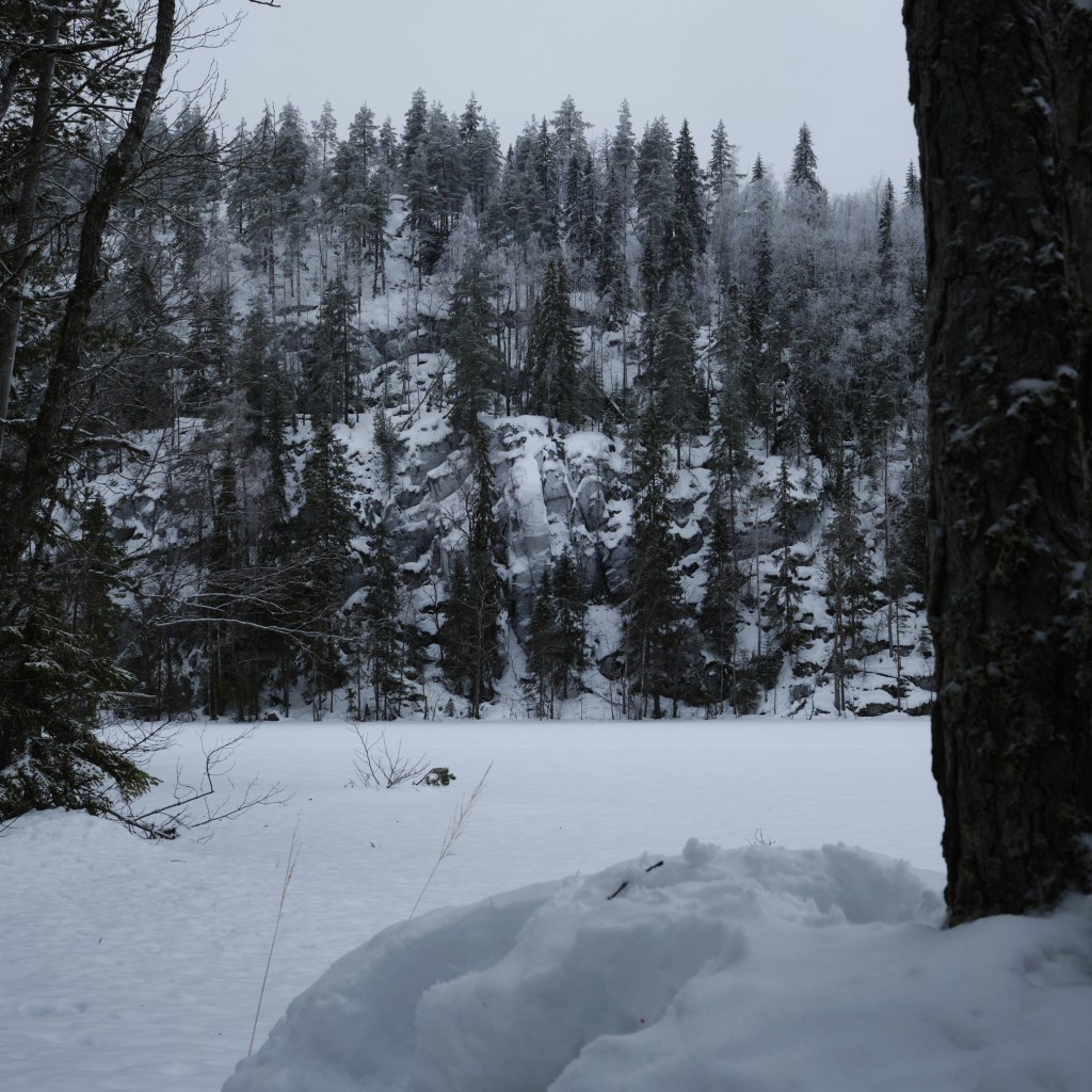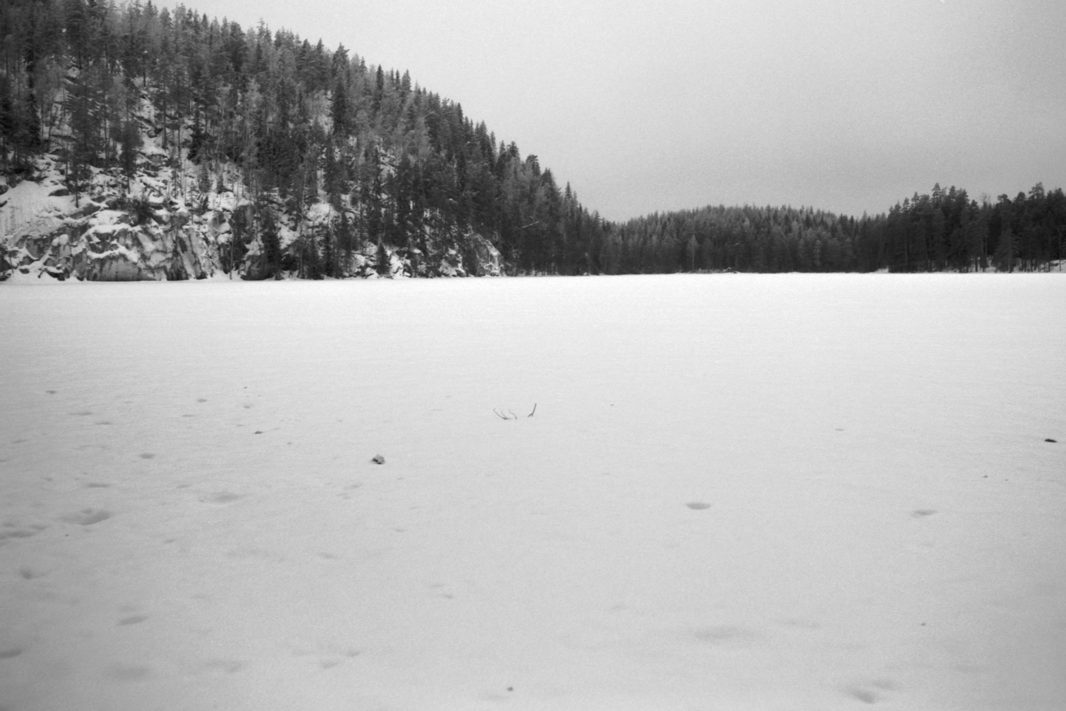 During this winter, I visited the Etelä-Konnevesi national park in central Finland. There is a 19 km long path through the whole park, but I only went through a shorter 5 km path. I went there in the evening and was expecting to at least get some nice pictures of sunset from the top of a large hill in the park, but it turned out that there were very thick clouds and the sun was not visible at all.