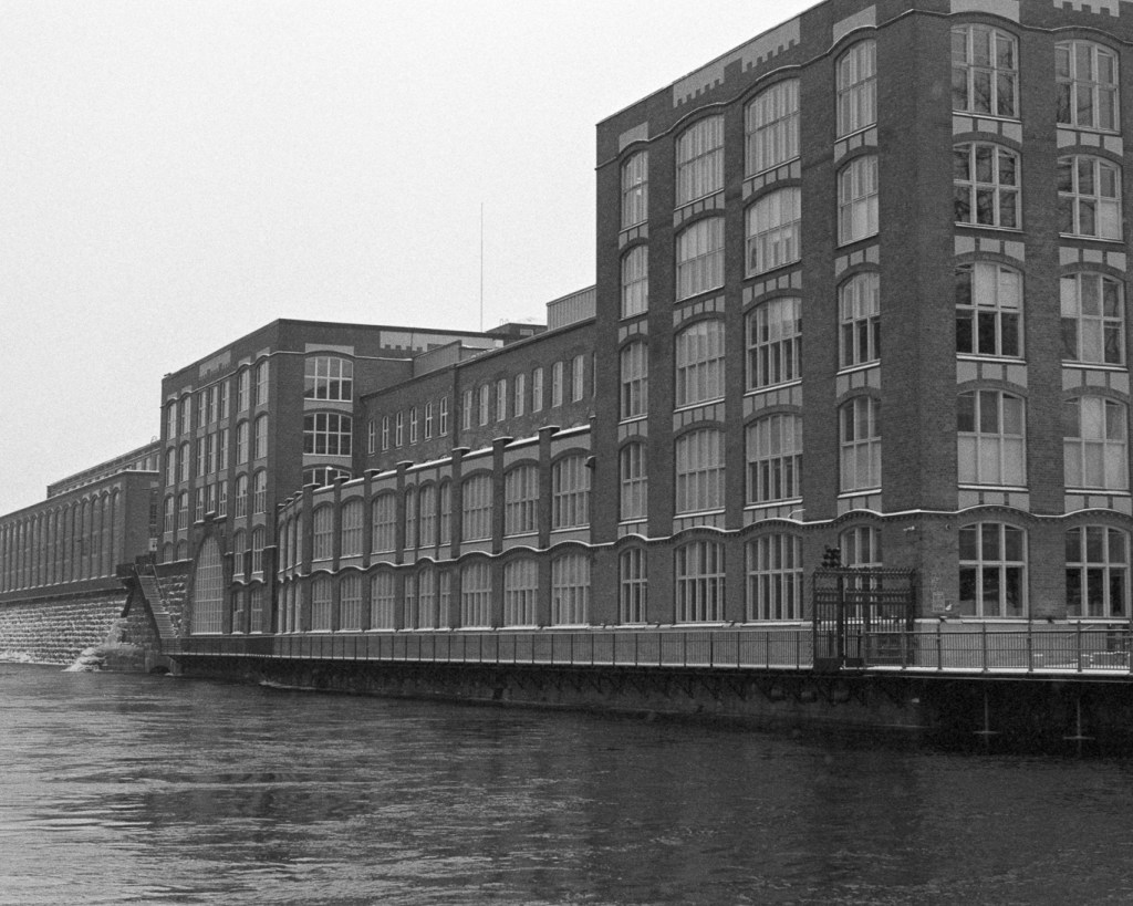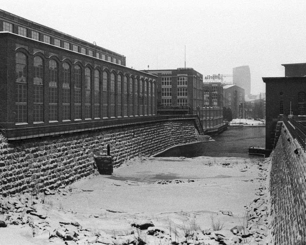 I took these pictures while walking around the rapids during a winter day. I had hoped the old factory buildings would look impressive in heavy snowfall, but the snowfall ended up being much lighter than predicted that day.